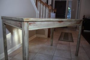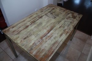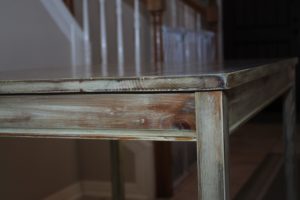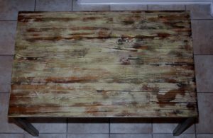 For paint – I used some random ideas & techniques. I used 4 or 5 colors sticking to variations of green, white, & gray. I’d mix a color with water (about a 50/50 ratio), then apply to the table using a rag and just rubbing the paint on the piece. After it dried, I’d lightly & quickly sand it to smooth out the strokes and knock down any raised wood (water does that). I repeated this process with all the colors I chose – sanding as I went to make sure the table had a look I liked.