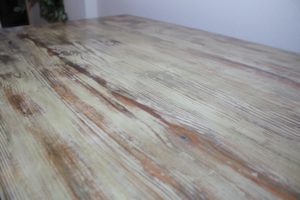 You can see some of the old cut marks from when it was a crafts table. And there are a few discolored old stains that changed the way the wood accepted the paint – creating really unique patterns.
