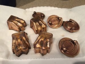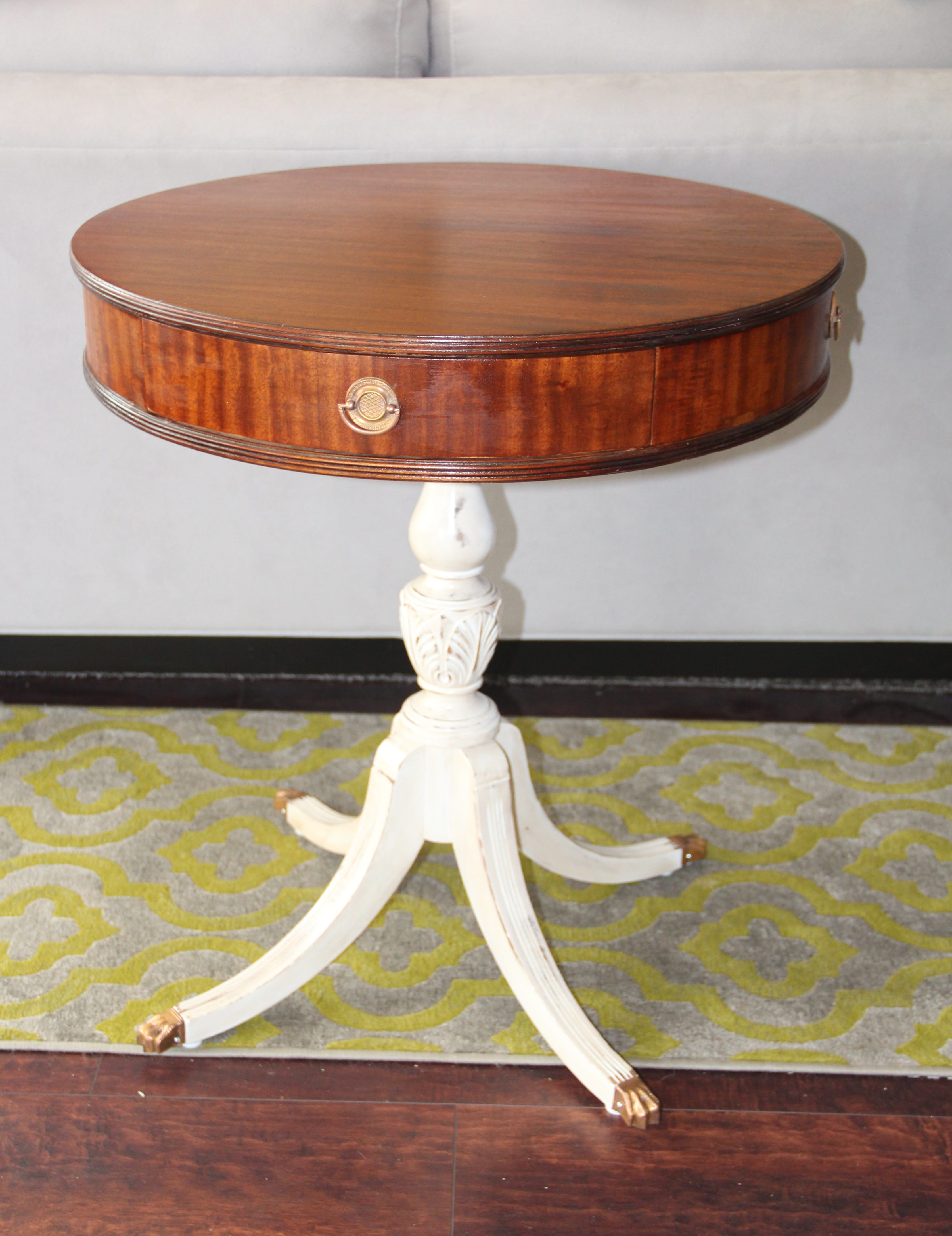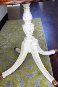 Once everything was sanded and cleaned, I painted the table base a classic white while staining the tabletop a medium color stain. I polished the original brass feet and drawer handles with some homemade concoctions to bring back their original shine. I lightly distressed the table base, then applied a few coats of a sealing layer to bring everything together.