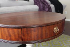 This is my mom’s vintage Imperial round bedside table growing up. Well, it wasn’t vintage when she was growing up, it was just a table. But it’s vintage now because that’s what the cool kids say. Because it has some sentimental value, I wanted to be careful to keep it as much original as possible. Unfortunately, the bottom stand and legs were in pretty bad shape – so a slight redesign was settled upon and it turned out great!
