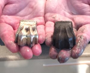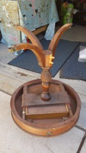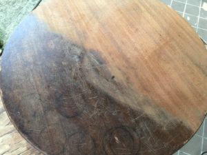 To get started, two legs were broken off the base, and were split in half. The wood was also very dry, resulting in splits and gaps in the other two legs and along the base/stand of the table. The table top had quite a few stains and marks, but was otherwise in great shape. I used some carefully placed glue and clamps to get the lets put back together, as well as patch up some of the splits in the wood along the base. I sanded, sanded and sanded the top of the table to get all the years of grim gone and was left with a nice smooth top. NOTE: never sand veneer too much as you don’t want to get to the layer underneath.